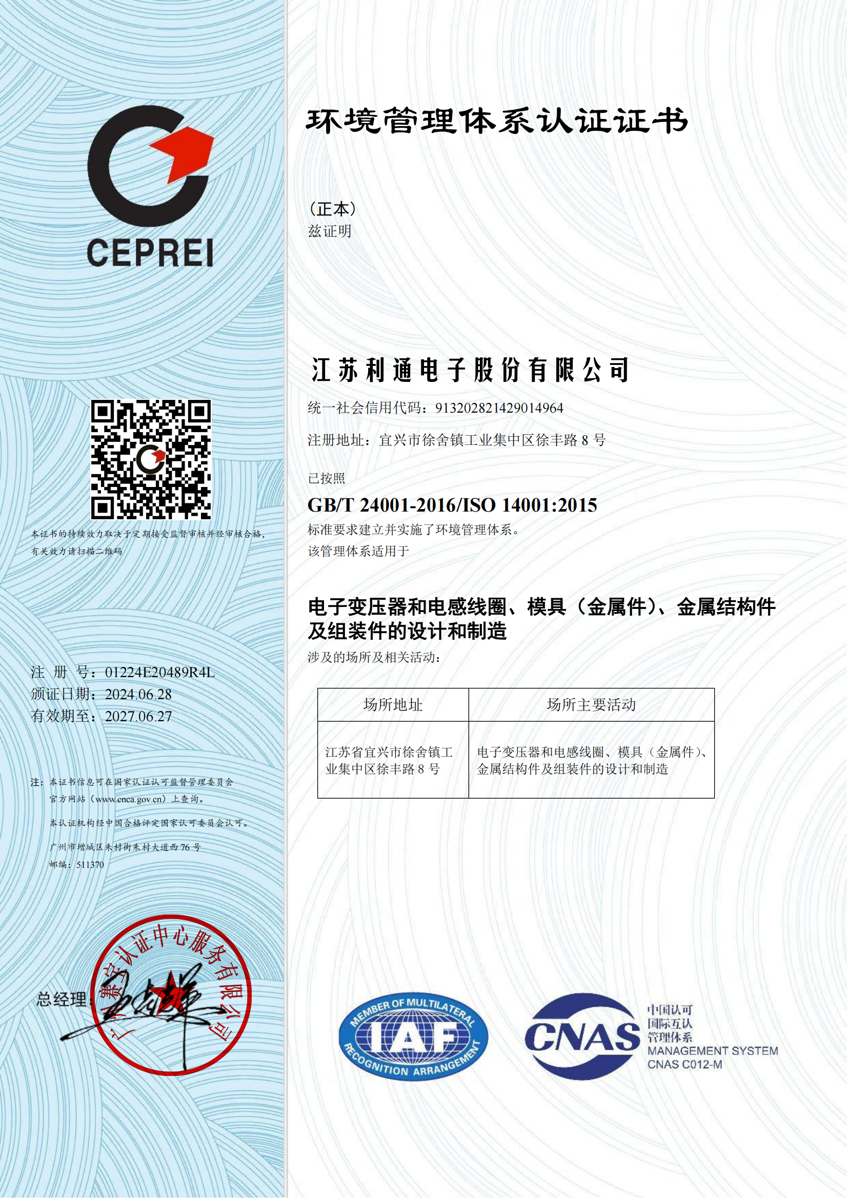 ISO 14001 環(huán)境管理體系認(rèn)證證書(shū)